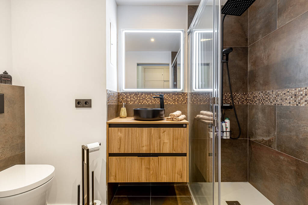 The apartment offers a welcoming, bright living room with an open-plan fitted kitchen, a spacious bedroom with built-in wardrobes and two bathrooms, one of which is en suite and the other equipped with a washing machine. Both, the living room and the bedroom, have access to a covered sun terrace of approximately 14 square metres, which faces south-west. Here you can enjoy lovely sea views, the landscape of Costa de la Calma and the surrounding nature.