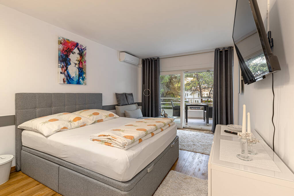 Se divide en una zona de entrada con armario empotrado, zona de estar/dormitorio con cocina americana, un espacioso baño con ducha y lavadora y una terraza cubierta con vistas al jardín. Está equipado con SAT-TV, calefacción por infrarojos y aire acondicionado frío/calor. La cocina está equipada con los siguientes electrodomésticos: vitrocerámica con campana extractora, horno y frigorífico.
