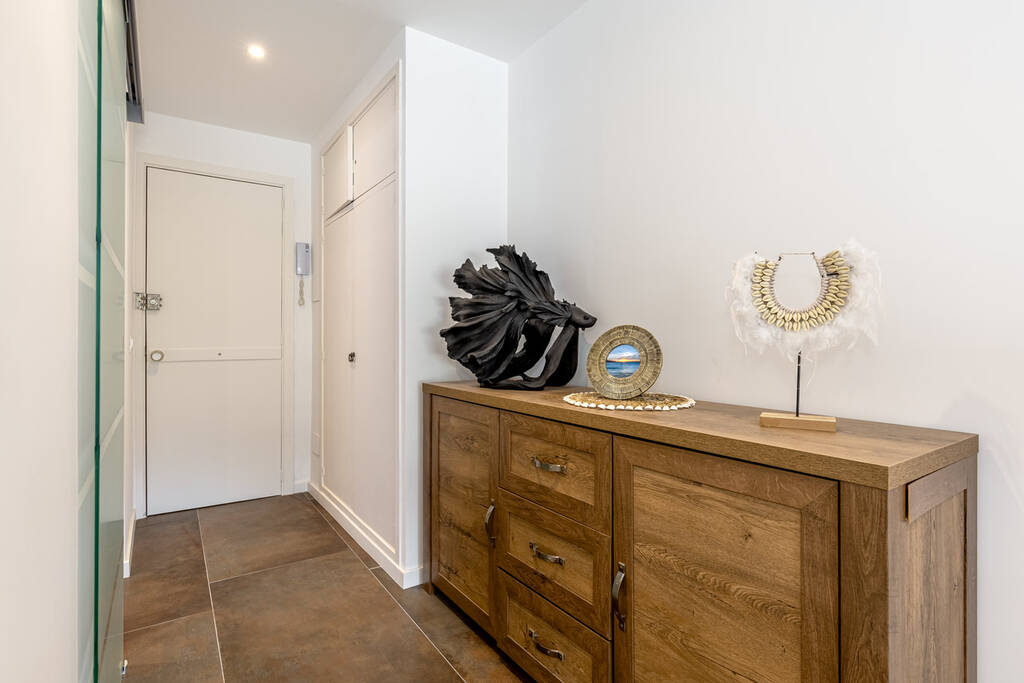 Die Wohnung bietet ein einladendes, helles Wohnzimmer mit offener Einbauküche, ein  großzügiges Schlafzimmer mit Einbauschränken und zwei Badezimmer, von denen eines en suite ist und das andere mit einer Waschmaschine ausgestattet ist. Sowohl das Wohnzimmer als auch das Schlafzimmer verfügen über einen Zugang zu einer etwa 14 Quadratmeter großen, überdachten Sonnenterrasse, die nach Südwesten ausgerichtet ist.    Hier eröffnet sich ein schöner Meerweitblick, auf die Landschaft der Costa de la Calma und die umliegende Natur.